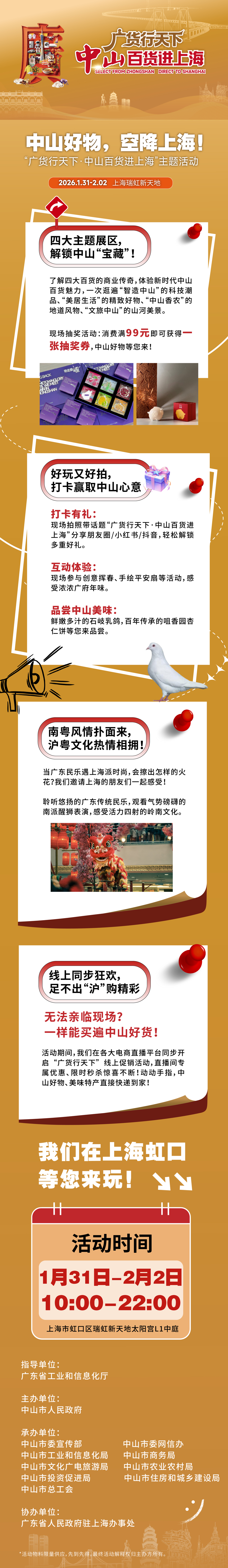 “广货行天下·中山百货进上海”活动将于1月31日至2月2日在上海瑞虹新天地太阳宫开展,广东中山将携智造优品、特色风物与文旅魅力,续写香山商帮与上海滩的百年佳话。本次活动由广东省工业和信息化厅指导,中山市人民政府主办,共将为期三天,包括展销、互动、演出、挥春活动,以及文旅与投资招商推介、项目签约等环节。