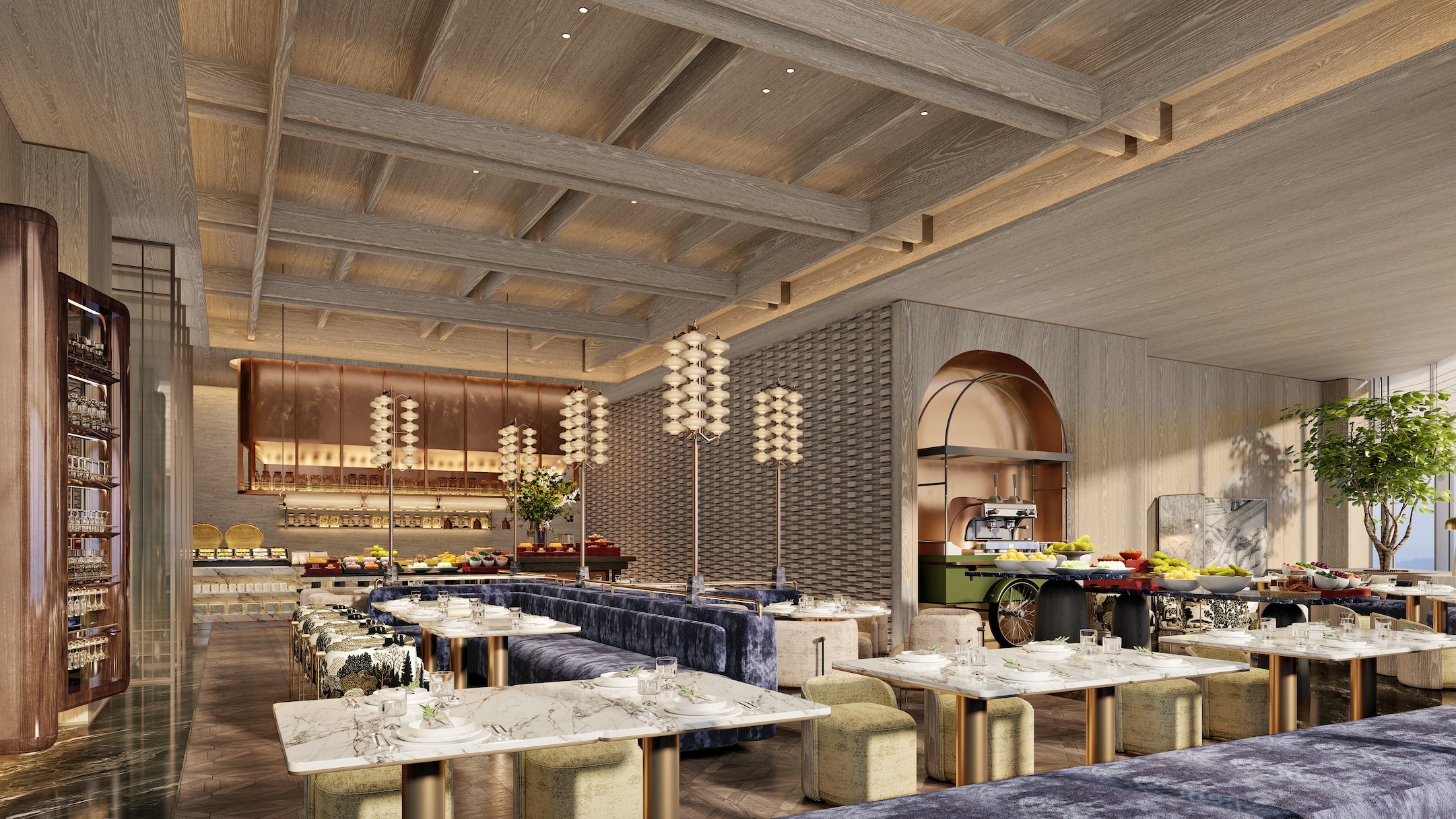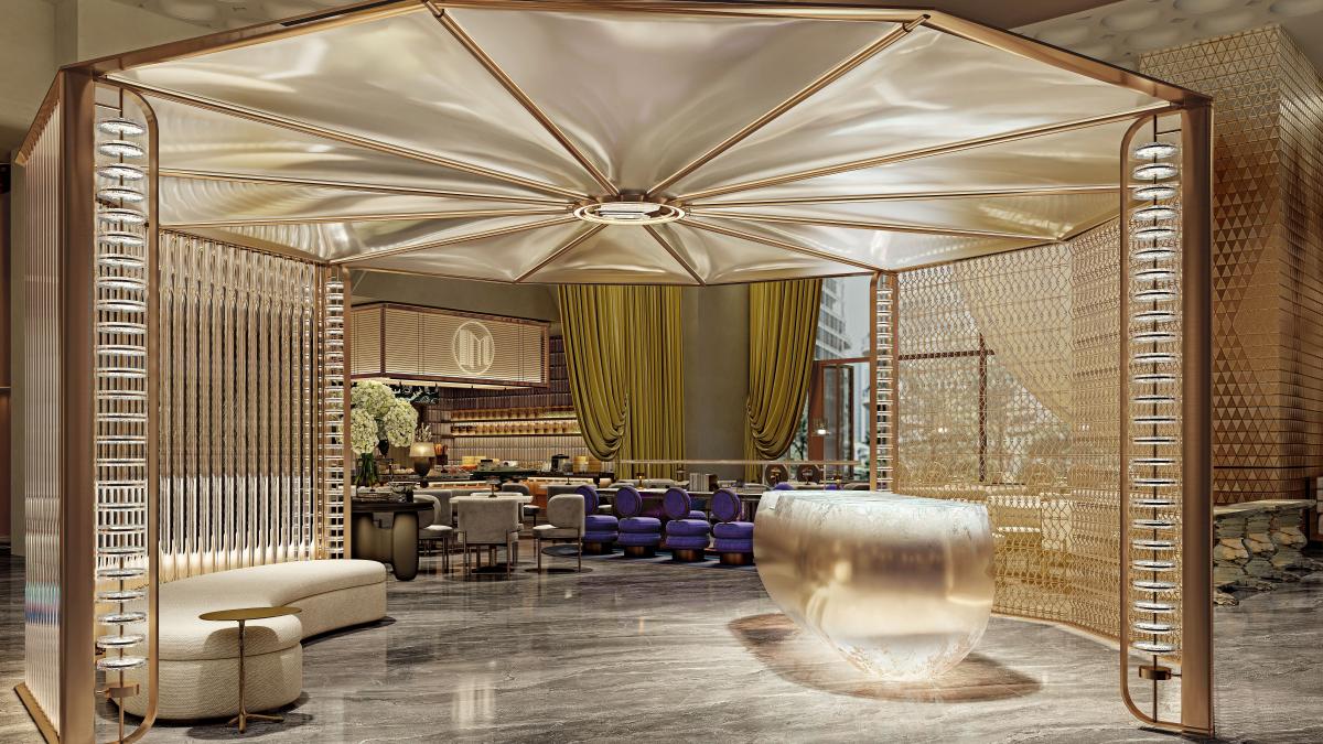 其建筑外观以“金元宝”为灵感,其中,万达美华酒店由万达酒店设计研究院倾力打造,室内设计则摒弃繁复符号,以质感材质、光影层次与艺术细节重构“鎏金”意象,低调优雅中透出现代人文温度,呼应北京的国际气质与体育精神。