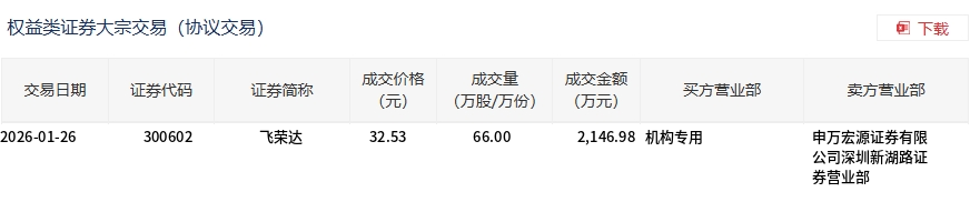 1月26日,飞荣达大宗交易成交66万股,成交额2146.98万元,占当日总成交额的1.07%,成交价32.53元,较市场收盘价35.75元折价9.01%。