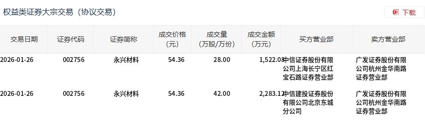 1月26日,永兴材料大宗交易成交70万股,成交额3805.2万元,占当日总成交额的3.12%,成交价54.36元,较市场收盘价55.75元折价2.49%。