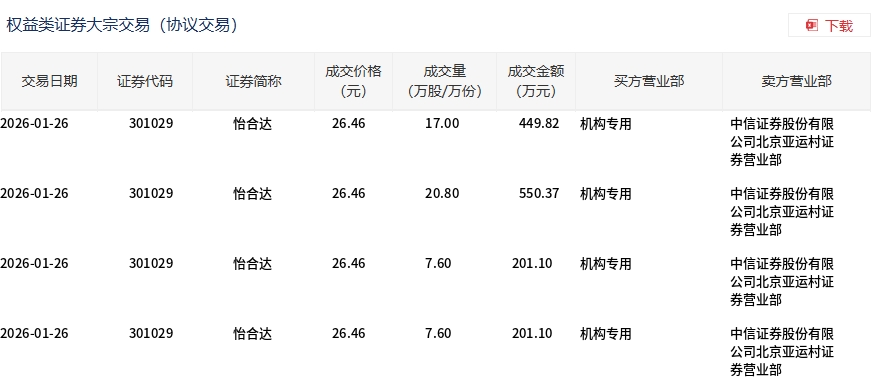 1月26日,怡合达大宗交易成交53万股,成交额1402.39万元,占当日总成交额的2.87%,成交价26.46元,较市场收盘价28.76元折价8%。