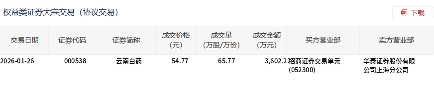 云南白药今日大宗交易折价成交65.77万股,成交额3602.22万元