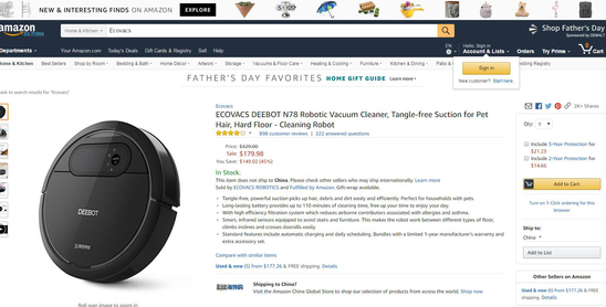 2016年8月在亚马逊美国正式上线,科沃斯在2016年亚马逊黑色星期五购物季中,就获得了扫地机器人品类的第一名,厨房家具品类第四名的成绩。其旗舰机型DN78一款单品在感恩节当天累积销售额则高达176万美元。