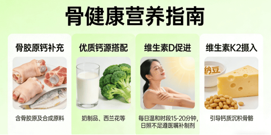 在“补”的层面,应重视营养支持。建议适当补充骨胶原肽或富含胶原蛋白的食物,如鱼皮、牛蹄筋、猪蹄等;同时摄入牛奶、豆制品等优质钙源。每日可在阳光温和时段暴露面部与手臂15–20分钟,以促进维生素D合成;日照不足时,可在医生指导下补充维生素D制剂。此外,适量食用纳豆、奶酪等富含维生素K2的食物,有助于引导钙质沉积于骨骼,减少流失。