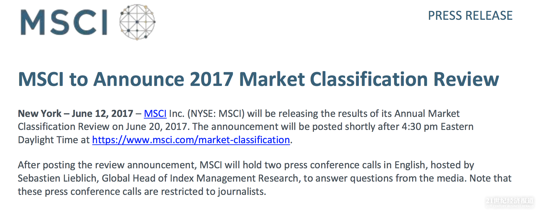 当地时间6月12日,全球指数供应商MSCI(明晟)发布消息称,确定于美东夏令时间6月20日下午4时30分左右(北京时间6月21日凌晨4时30分)在其网站公布本年度的市场分类审议结果声明,届时可以登录进行查询。中国A股是否能被纳入其新兴市场指数再次成为焦点,此前,A股曾三度冲刺MSCI未果。结果公布后,MSCI将召开两次电话媒体会。