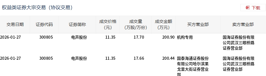 1月27日,电声股份大宗交易成交35.36万股,成交额401.34万元,占当日总成交额的1.3%,成交价11.35元,较市场收盘价12.97元折价12.49%。