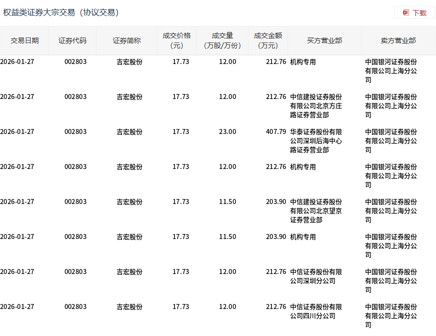 1月27日,吉宏股份大宗交易成交106万股,成交额1879.39万元,占当日总成交额的5.62%,成交价17.73元,较市场收盘价20.15元折价12.01%。