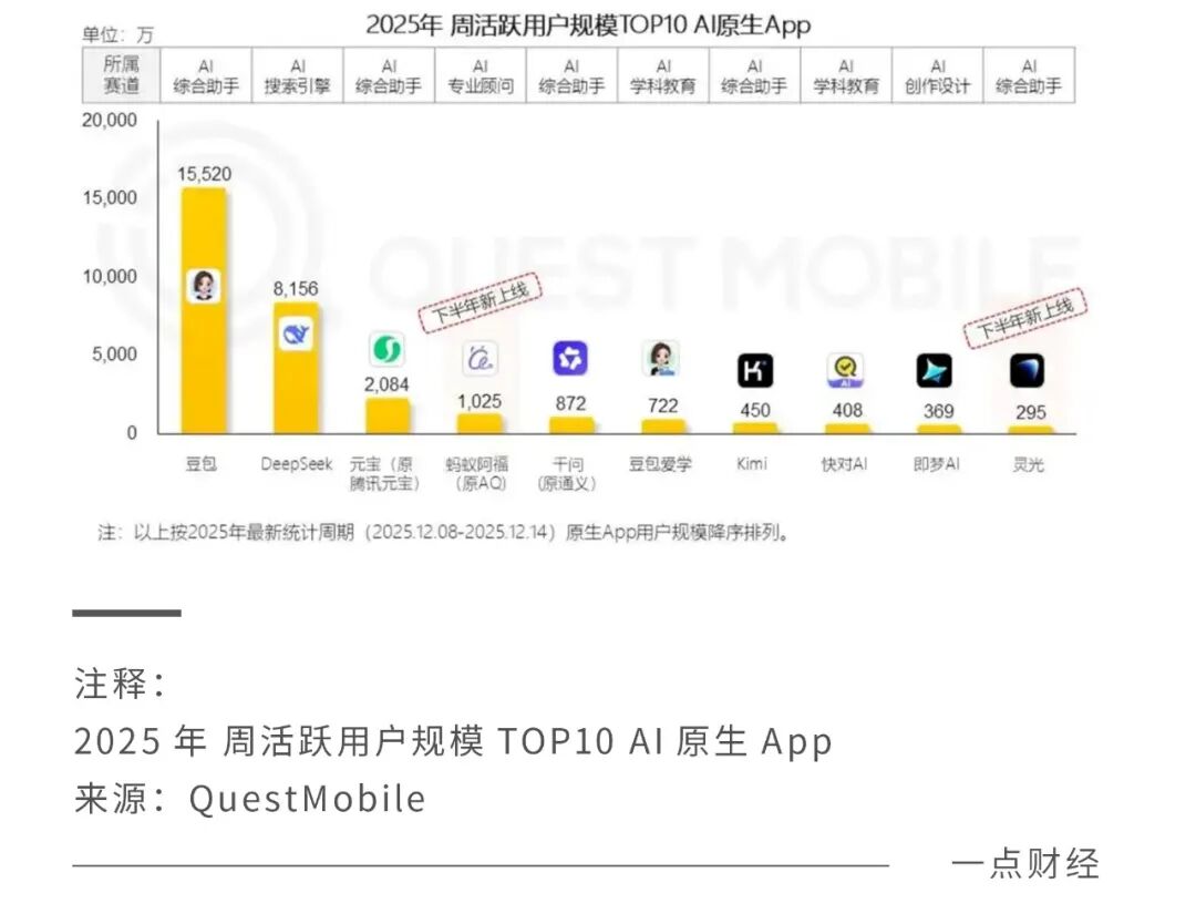 根据研究机构QuestMobile的报告,在2025年12月8日至14日的统计周期内,豆包的周活跃用户规模达到1.55亿,位列市场首位。DeepSeek以8156万的周活跃用户排名第二,元宝以2084万位居第三。