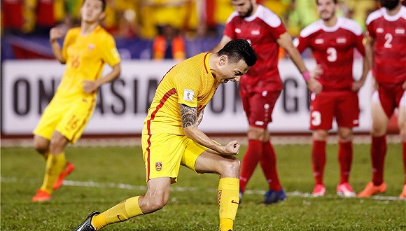 通过麦克风的回传,现场5000中国球迷的加油声清晰可现。脱下西服的里皮改打三中卫,意图在中前场夺得更多控制权。随着时间推移,叙利亚照例祭出了破坏型踢法,接近一切可能拖延时间,打破比赛的流畅性。为了加强进攻,里皮撤下张稀哲,换上了高中锋肖智。第66分钟,张琳芃的坚决拼抢为中国男足抢得了一个点球,郜林站在了主罚点前。同样是点球,郜林也没有错失机会,他的射门钻入左下角。1比1,中国队扳平比分,郜林结束了长达3年在国家队的进球荒。