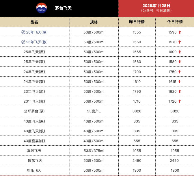 “今日酒价”披露的批发参考价显示,1月28日,26年飞天茅台原箱较前一日上涨35元,报1590元/瓶;26年飞天茅台散瓶较前一日上涨20元,报1570元/瓶。25年飞天茅台原箱较前一日上涨35元,报1600元/瓶;25年飞天茅台散瓶较前一日上涨20元,报1580元/瓶。24年飞天茅台原箱较前一日上涨50元,报1750元/瓶;24年飞天茅台散瓶较前一日上涨5元,报1615元/瓶。