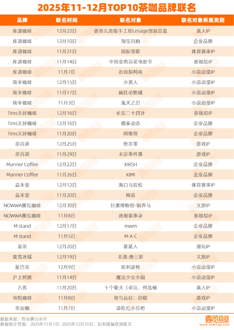 在高额的营销投入之下,联名仍是茶咖行业的主流玩法。据茶咖观察统计,2025年11月至12月,全国门店数量排名前十的茶咖品牌中,共有15个品牌累计展开28起联名营销活动,联名对象覆盖多个领域。联名最多的是库迪咖啡,有5次联名,喜茶、蜜雪冰城、星巴克、沪上阿姨、古茗、肯悦咖啡、幸运咖仅上线1起联名。