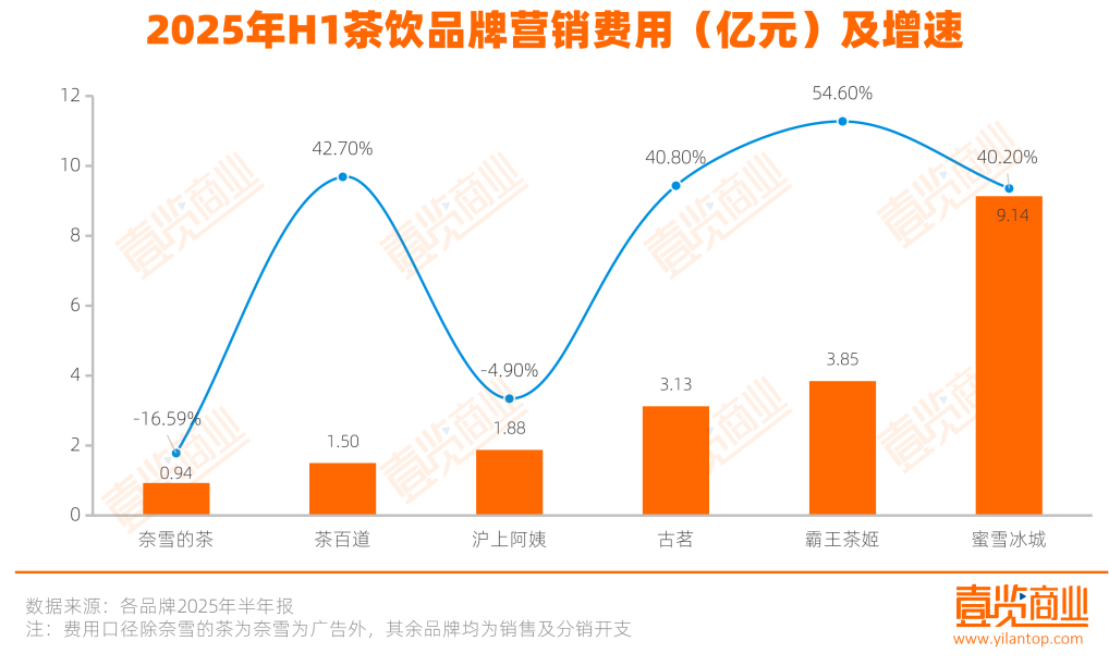 据壹览商业不完全统计,截至2025年上半年,上市茶饮品牌中,仅奈雪的茶营销相关费用不足1亿元,且同比下降了16.59%;蜜雪冰城、古茗、茶百道、沪上阿姨、霸王茶姬营销相关费用均过亿元,其中沪上阿姨同比增速下降了4.90%,而蜜雪冰城、古茗、茶百道的营销相关费用同比增长均超过40%。