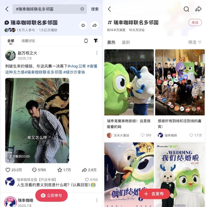瑞幸咖啡则积极通过互联网营销打造企业IP,其与教育类APP多邻国的趣味联动,成为2025年的经典营销案例。瑞幸的麋鹿形象与多邻国的绿鸟形象,结成了跨越种族的CP,并在抖音、小红书等平台上持续记录了“婚礼日常”,甚至拍摄了“豪门联姻”的短剧。