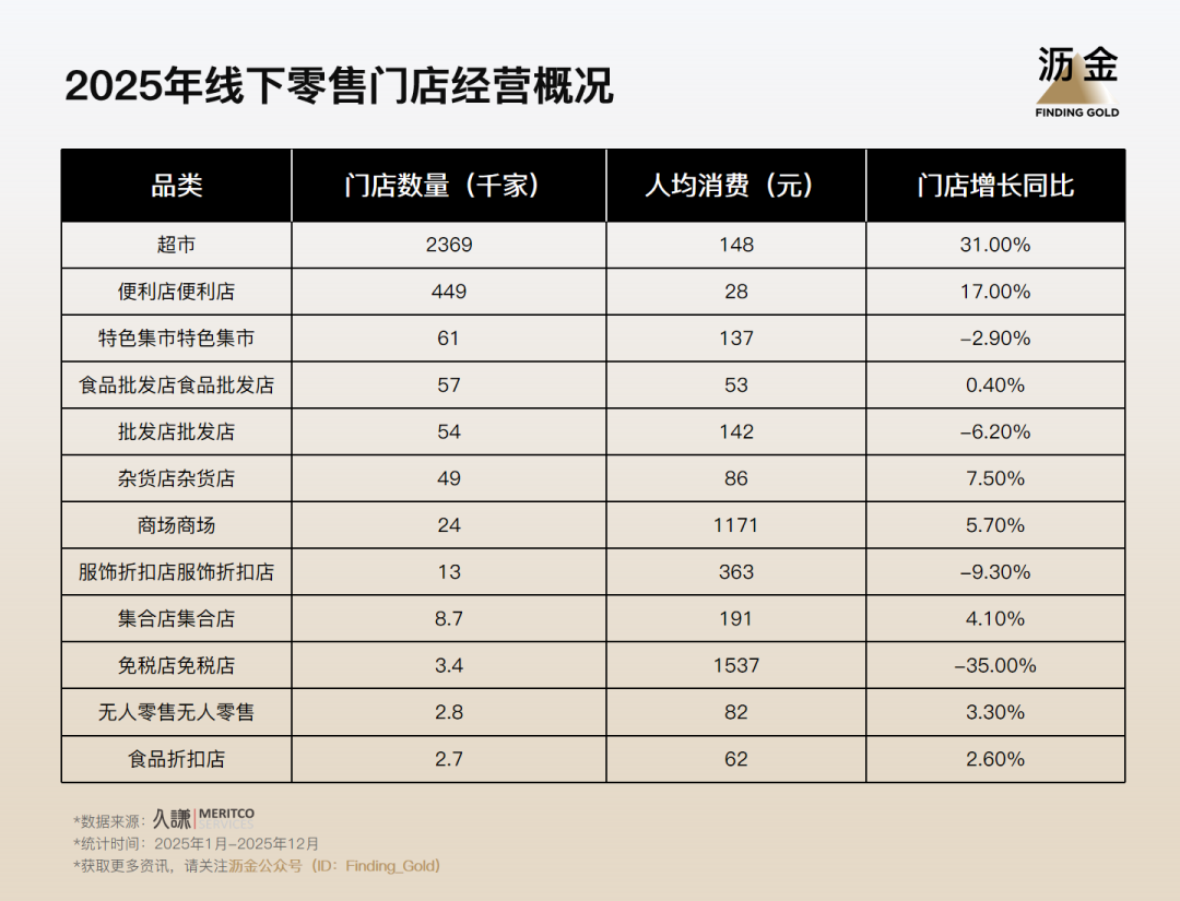 沥金联合久谦中台,提取了若干线下零售品类的门店和经营数据,希望为读者呈现一幅关于线下消费生态的清晰图解。