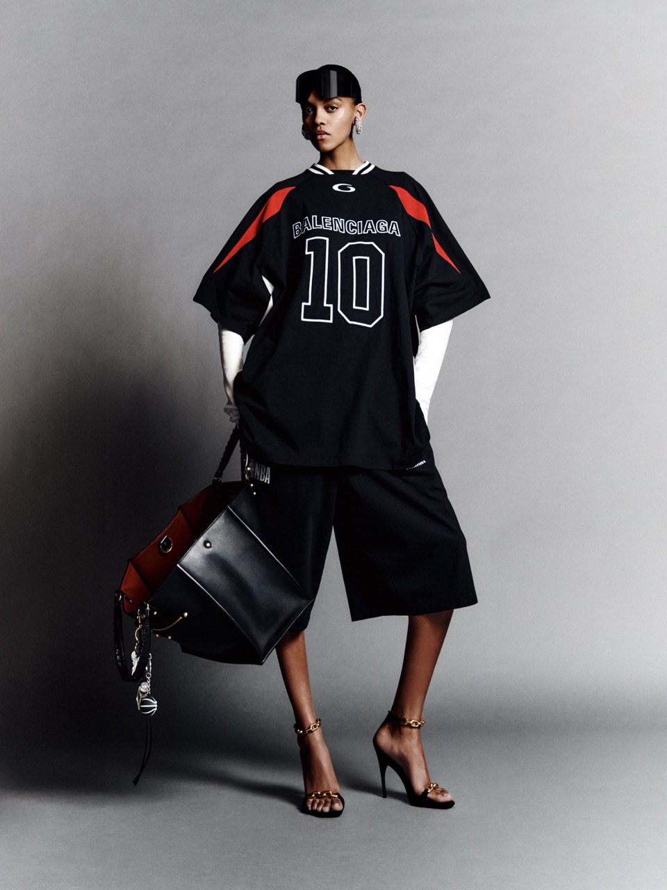 联名系列涵盖成衣、鞋履、配饰及小型皮具等无性别单品,版型在运动服与Balenciaga标志性的廓形之间取得平衡。T 恤、运动套装、棒球衫及教练夹克等单品选用皮革、尼龙缎布、再生棉府绸与日本丹宁等材质,强调结构感与穿着舒适度。数字“10”作为贯穿细节,指向品牌历史坐标,也成为连接双方语境的隐性符号。