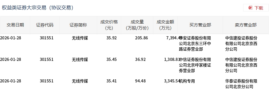 1月28日,无线传媒大宗交易成交337.26万股,成交额1.2亿元,占当日总成交额的26.77%,成交均价35.73元,较市场收盘价35.95元折价0.62%,其中最高成交价35.92元,最低成交价35.41元。