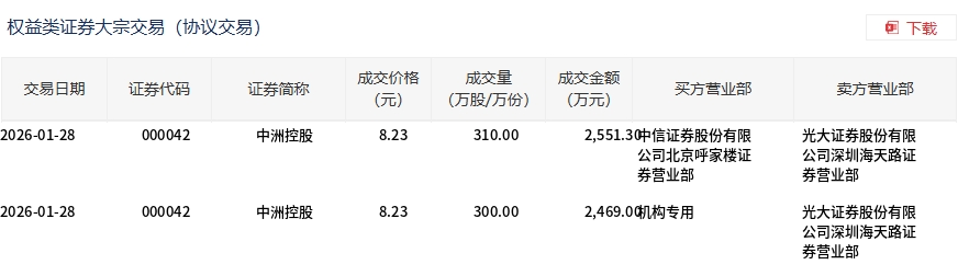 1月28日,中洲控股大宗交易成交610万股,成交额5020.3万元,占当日总成交额的26.17%,成交价8.23元,较市场收盘价8.44元折价2.49%。
