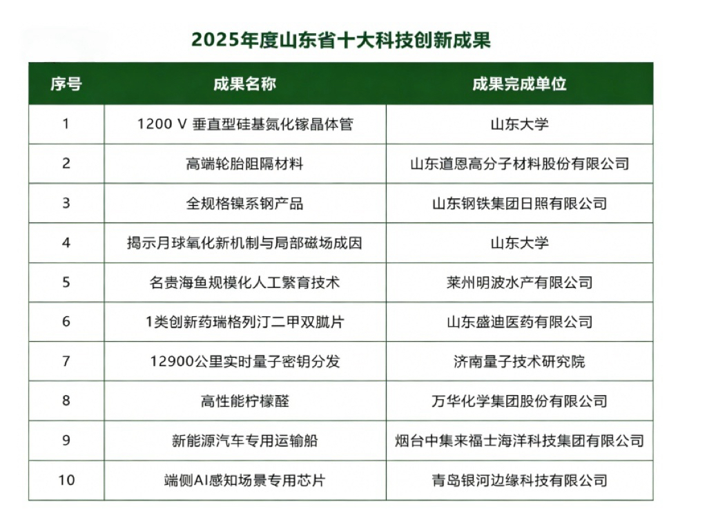 事实上,关于山东科技创新,最近刚发生一件大事,1月25日晚,2025年度山东省十大科技创新成果在济南发布,揭示月球氧化新机制与局部磁场成因、12900公里实时量子密钥分发、新能源汽车专用运输船、端侧AI感知场景专用芯片等10项成果获评2025年度山东省十大科技创新成果。
