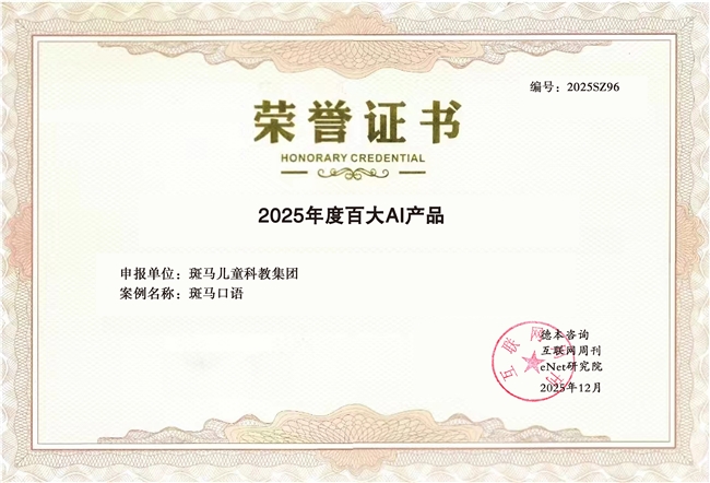 近日,由《互联网周刊》、DBC德本咨询及eNet研究院联合发布的“2025年度百大AI产品”榜单正式揭晓。斑马儿童科教集团旗下“斑马口语”凭借其在生成式AI方向的创新性与引领性实践应用,率先成为教育垂直领域首个真正产业化落地的AI Agent,成功入选2025年度行业百大AI产品。