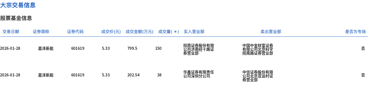 1月28日,嘉泽新能大宗交易成交188万股,成交额1002.04万元,占当日总成交额的0.88%,成交价5.33元,较市场收盘价6.13元折价13.05%。