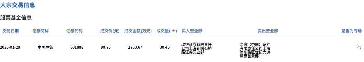 1月28日,中国中免大宗交易成交30.45万股,成交额2763.67万元,占当日总成交额的0.67%,成交价90.75元,较市场收盘价89.84元溢价1.01%。