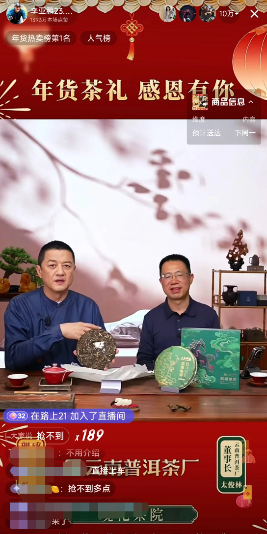 李亚鹏1月23日这场“年货茶礼感恩有你”云南普洱茶厂专场直播,彻底刷新了外界对其带货能力的认知。