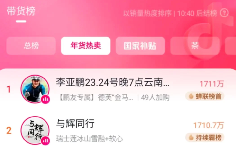 尽管“与辉同行”凭借16.5小时的超长直播时长,单日销售额仍高于李亚鹏直播间,但后者以四分之一的时长实现如此成绩,已然创造了个人带货生涯的巅峰。