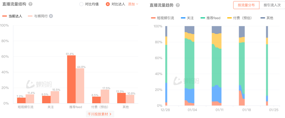从付费投流比例来看,其直播间付费投流比仅为8.5%,约为“与辉同行”直播间的1/2,这意味着李亚鹏直播间这波热度,主要是靠相关话题热度带动,而并非商业投流操作下的结果。对比之下,李亚鹏直播间的流量结构中,最高的一项是平台推荐feed流带来的人气,比例高达61.4%,高于“与辉同行”(44.8%)。