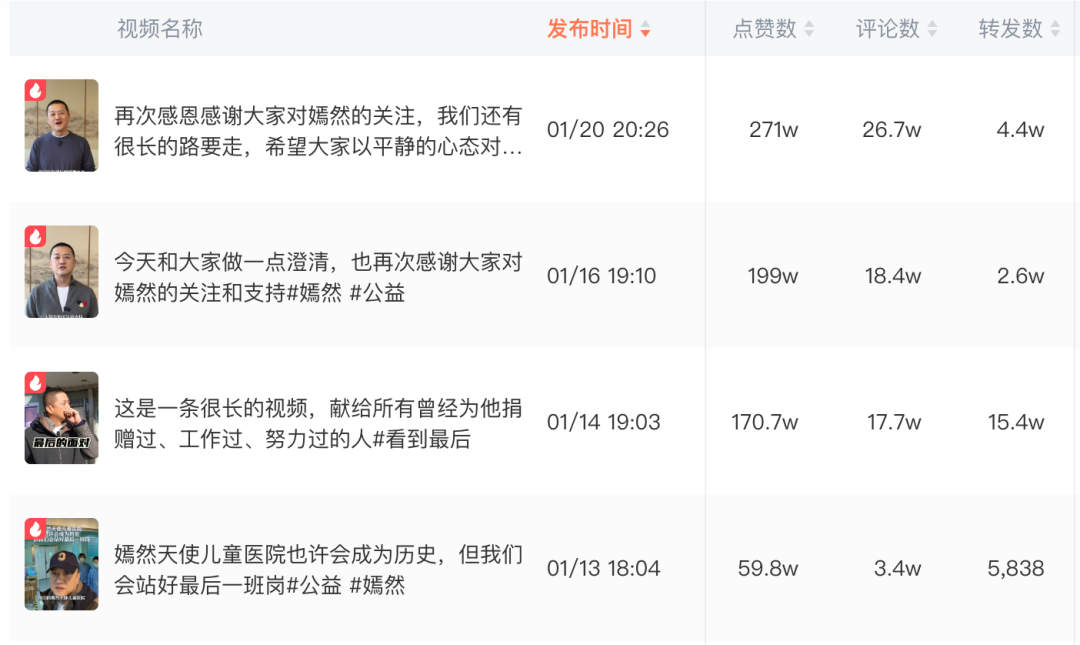 但从流量来看,这条视频热度大幅回落,点赞数仅为9.5万,远不及前几条关于嫣然天使儿童医院的视频关注度高。
