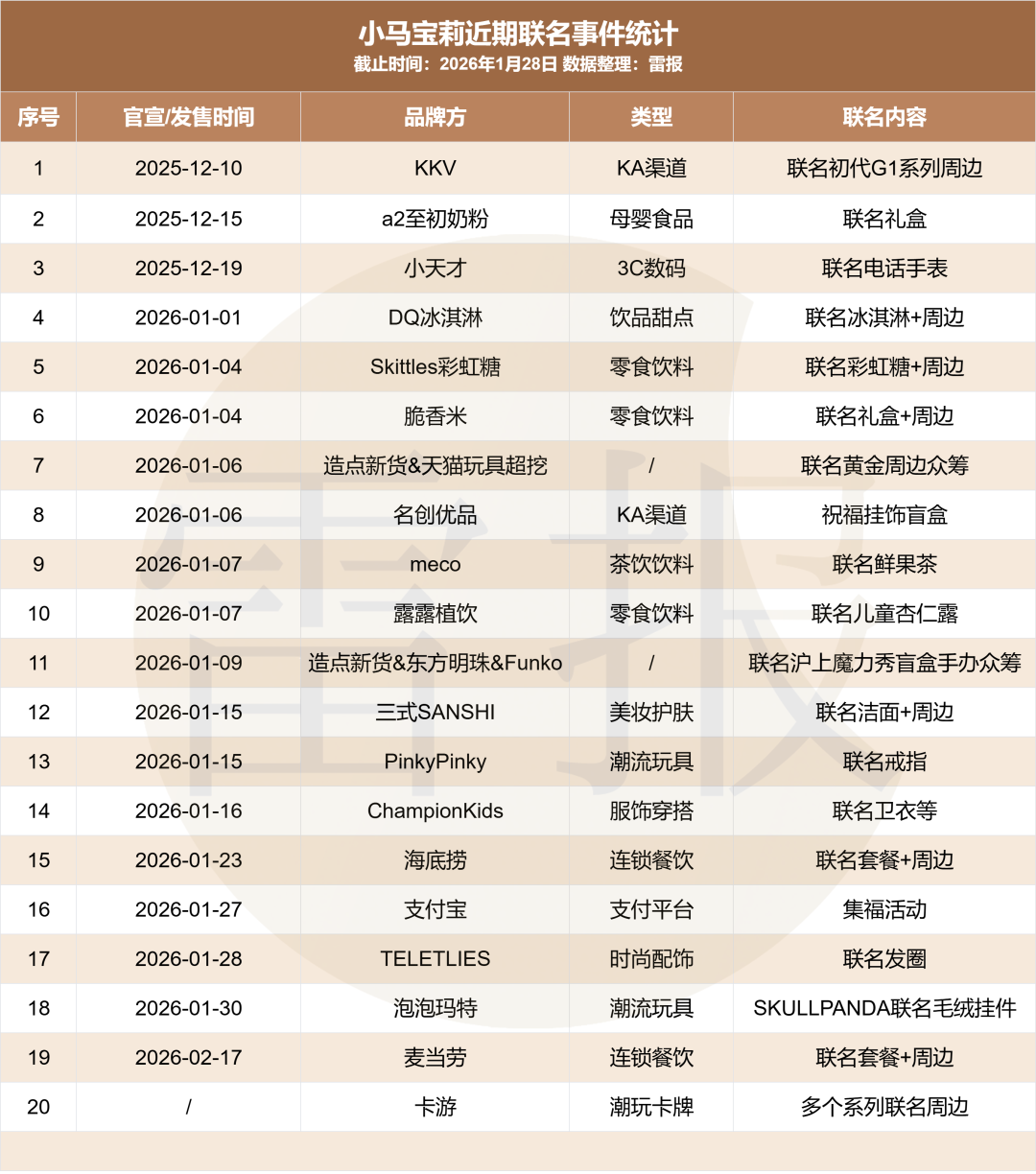 据雷报不完全统计,“小马宝莉”近期官宣联名便已至少有20起,且合作品牌覆盖连锁餐饮、零食饮料、美妆个护、潮玩卡牌、3C数码、母婴食品等多元领域。显然,随着农历马年的到来,该IP有望实现更大的商业价值爆发。