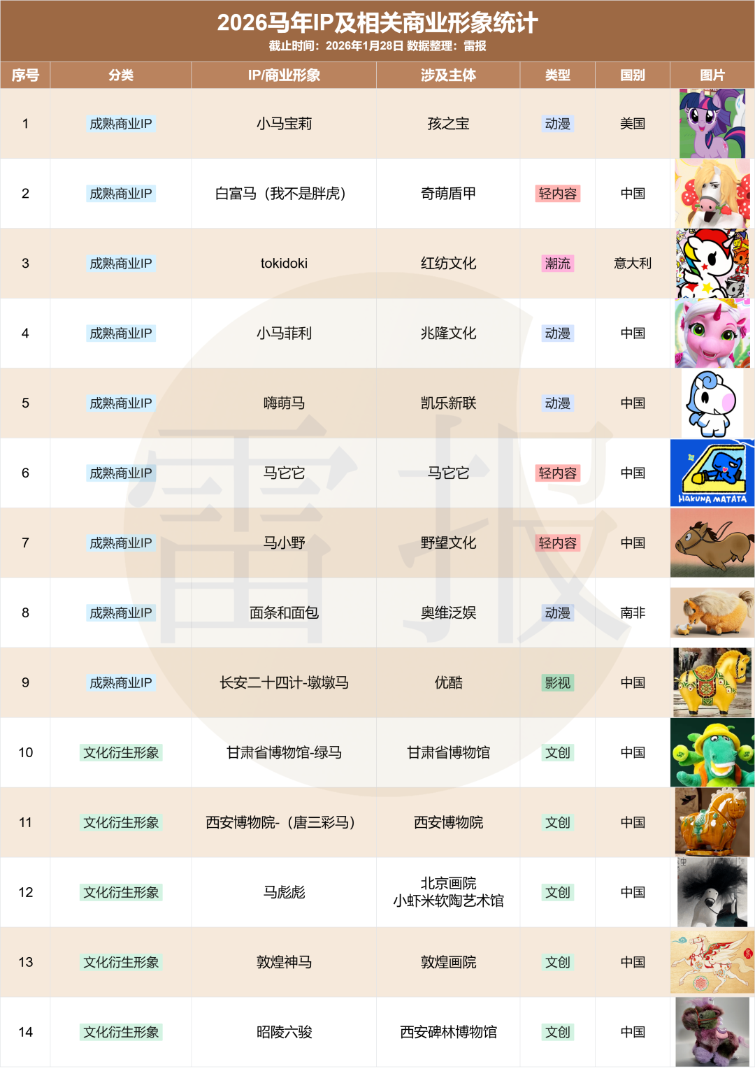 据雷报不完全统计,目前至少有27个相对活跃的马年IP及商业形象出现在市场中,整体上可分为【成熟商业IP】、【文化衍生形象】及【马年定制文创/形象】三大类。