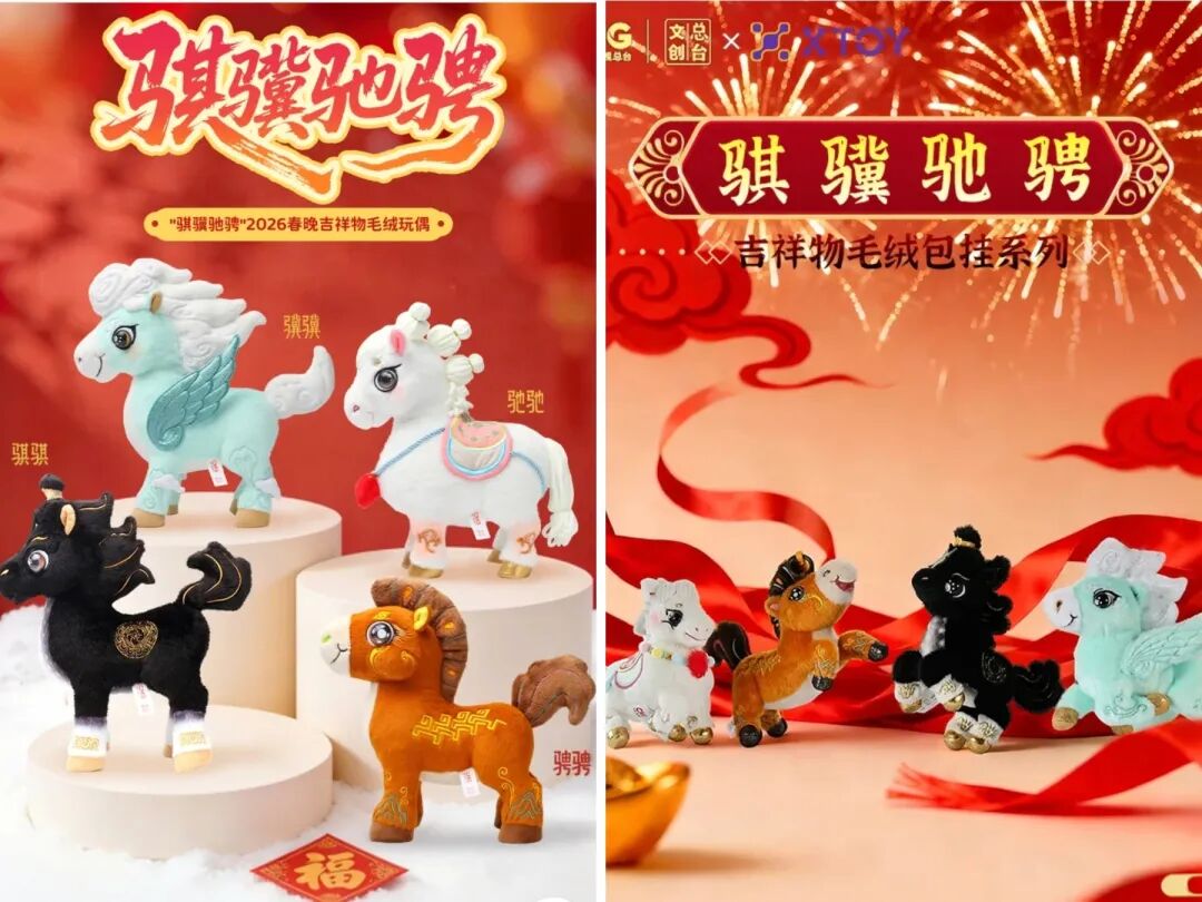总台马年吉祥物“骐骥驰骋”由“骐骐”“骥骥”“驰驰”“骋骋”四匹融合不同设计元素的小马组成,目前总台文创已围绕该形象推出毛绒玩偶、毛绒包挂等周边,并借鉴潮玩行业的明星赋能玩法,让其高频亮相于春晚联排艺人的相关场景中。但受形象设计的全网口碑争议、加之历年央视在春晚吉祥物IP的长线运营上投入有限等因素影响,这一吉祥物也大概率将随春晚落幕快速淡出大众视野。
