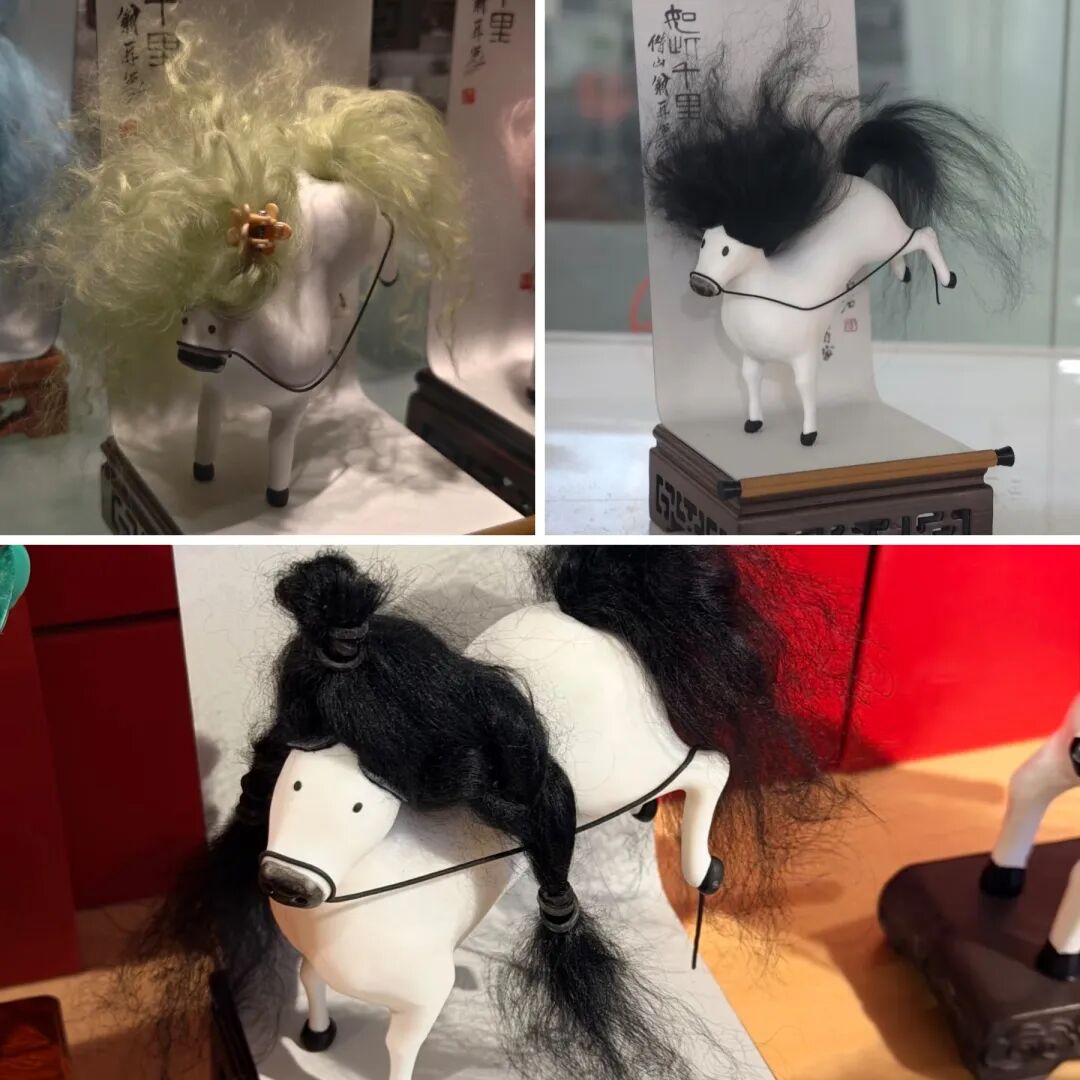 和“绿马”的打造思路一脉相承,“马彪彪”的形象再设计,既精准拿捏了原型文物的神韵精髓,更关键的是将其转化为当代年轻人易理解、能共情的抽象视觉符号。比如它把齐白石奔马画作中的写意笔触,凝练为玩偶一头“乱糟糟”的爆炸毛发造型,这份看似不修边幅的设计,恰好戳中了打工人早起通勤来不及打理的日常狼狈,也契合了年轻人“潦草却自由”的精神状态与叛逆心境。