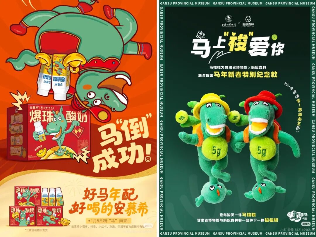 “绿马”以甘肃省博物馆的镇馆之宝“铜奔马”(也即“马踏飞燕”)为原型进行再创作。早在2022年6月,“绿马”跳跳和“绿马”奔奔两个形象便已经推出,并凭借搞笑丑萌的形象而爆火出圈。过去几年,“绿马”成为甘肃博物馆的引流利器,吸引了众多游客前来参观,围绕“绿马”打造的毛绒玩偶、冰箱贴等文创周边也屡屡出圈,甘肃博物馆文创团队也成为全国各地博物馆借鉴的标杆。近期,“绿马”与安慕希及蚂蚁森林合作,分别推出联名礼盒及毛绒挂件。