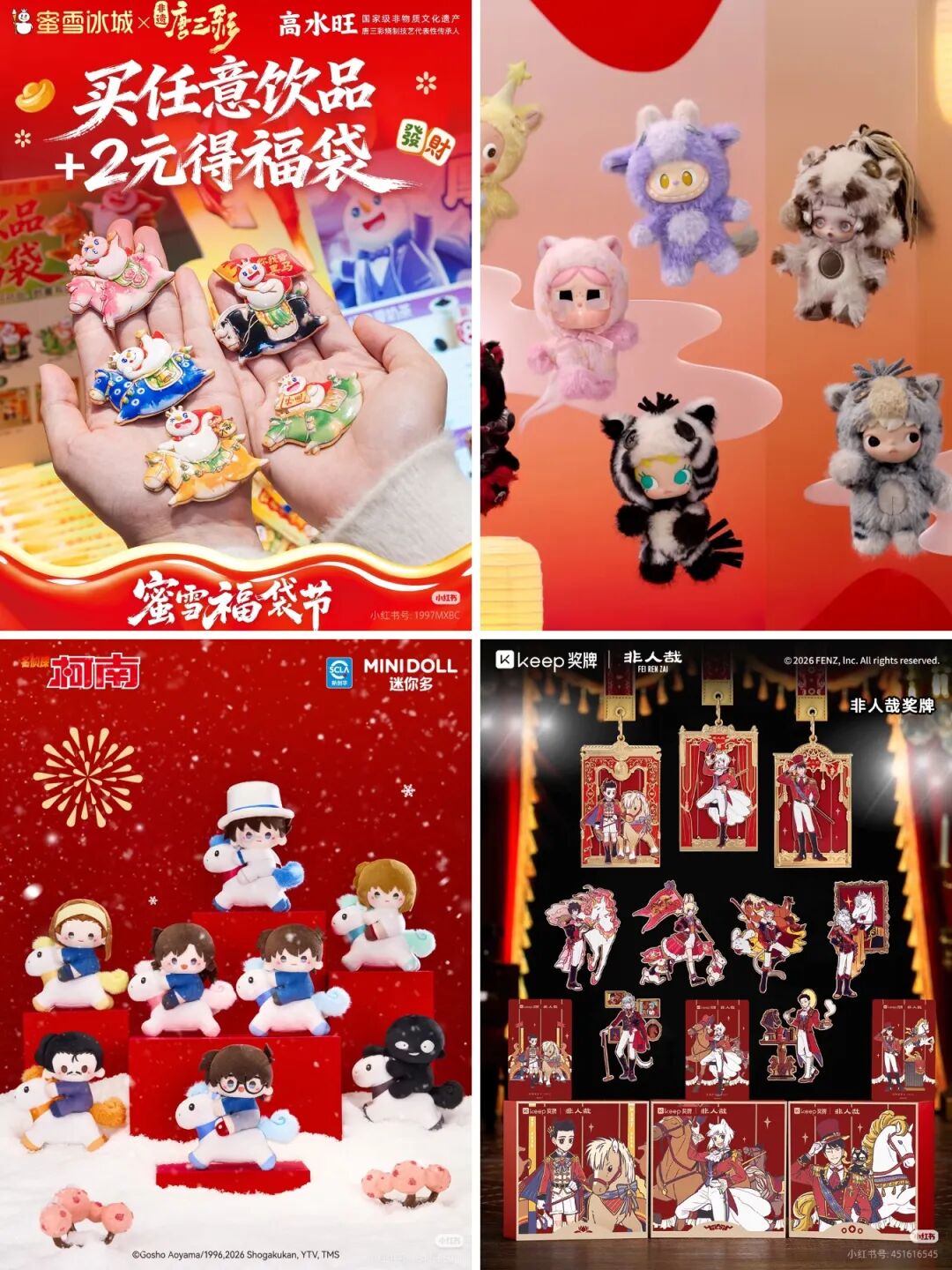 除上述三大类别外,更多品牌与IP方也纷纷融入“马”元素布局马年营销,例如泡泡玛特推出“马力全开系列毛绒挂件”、名创优品围绕柯南IP打造“以梦为马毛绒挂件”、非人哉联合KEEP推出马年主题奖牌、蜜雪冰城携手唐三彩非遗传承人高水旺,以雪王为核心打造系列联名周边等。