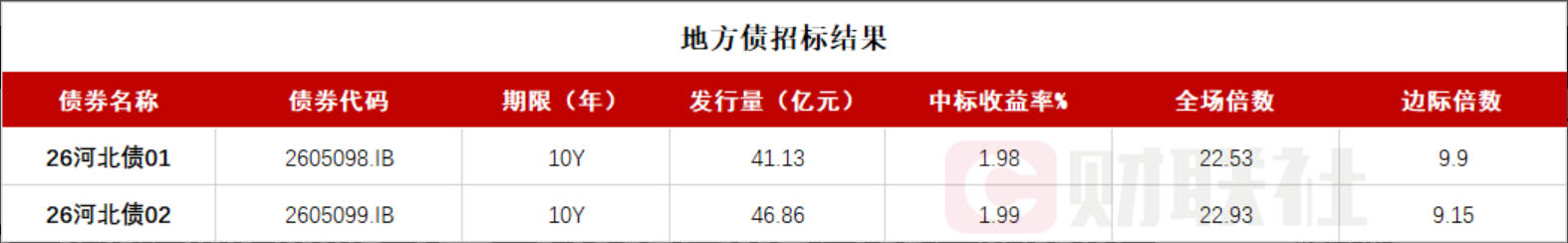 据财联社消息,河北省政府两期地方债已招标结束,投标倍数均在22倍之上。