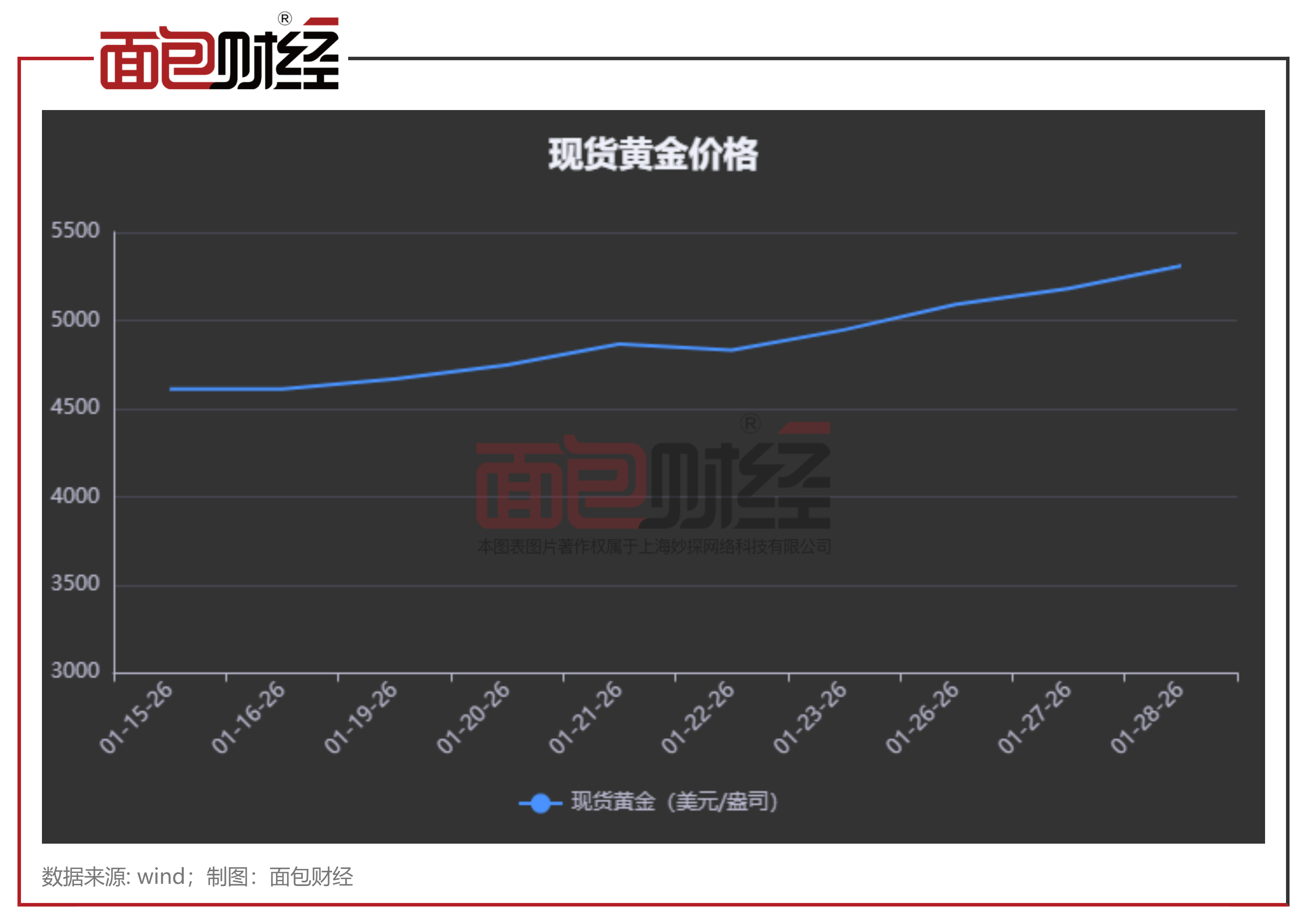 数据显示,2026年以来,黄金价格持续强势上行,屡创历史新高。截至2026年1月28日,现货黄金日内最高触及5310美元/盎司,较1月1日的约4350美元/盎司上涨逾22%。1月27日,伦敦金现收报5180.23美元/盎司,单日涨幅达3.4%,为2025年4月以来最大单日涨幅。