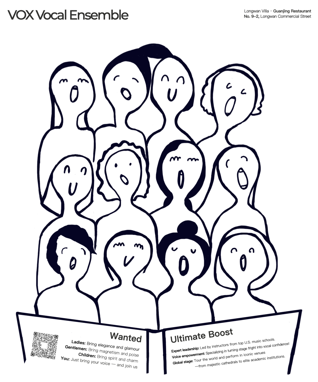 VOX 由来自美国最高音乐学府的资深音乐家执教。依托于深厚的学术底蕴与丰富的国际教学经验,我们打破传统的机械式排练,采用国际领先的声乐训练体系,致力于为每一位成员提供从发声方法、乐理知识到舞台演绎的全方位专业指导。