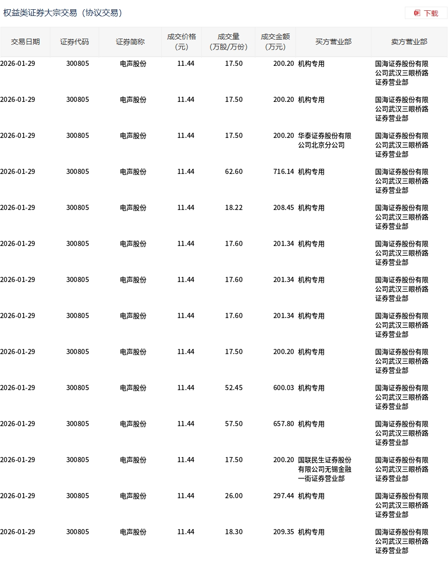 1月29日,电声股份大宗交易成交375.37万股,成交额4294.23万元,占当日总成交额的9.85%,成交价11.44元,较市场收盘价13.06元折价12.4%。