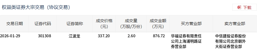 1月29日,江波龙大宗交易成交2.6万股,成交额876.72万元,占当日总成交额的0.13%,成交价337.2元,较市场收盘价358.8元折价6.02%。