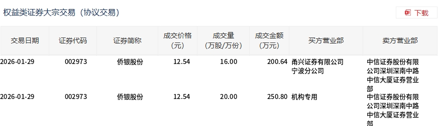 1月29日,侨银股份大宗交易成交36万股,成交额451.44万元,占当日总成交额的4.78%,成交价12.54元,较市场收盘价14.11元折价11.13%。