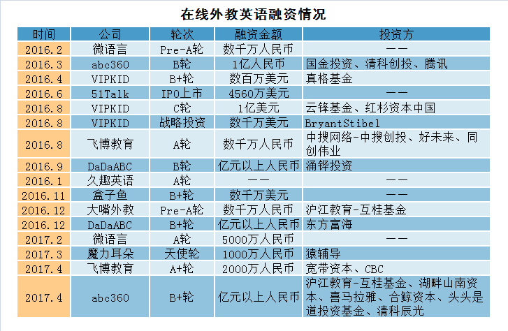 这是首家在线外教类公司上市。而其他此类公司虽然未上市,与之相比却毫不逊色,比如VIPKID在2016年一年时间内便融资三次,位居2016年在线教育公司融资之首,tutorabc(vipabc)母公司则在2015年获得2亿美元C轮融资。