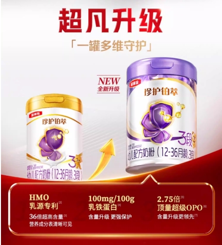珍护铂萃近期完成配方焕新,核心亮点在于含HMO(2’-FL)专利{1}的36倍超高含量乳源HMO,含9大种类HMO,该成分深度融入六大营养维度,形成协同守护力。