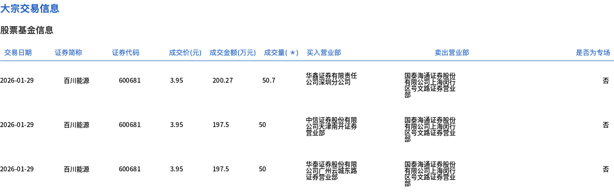 1月29日,百川能源大宗交易成交150.7万股,成交额595.27万元,占当日总成交额的2.46%,成交价3.95元,较市场收盘价4.3元折价8.14%。