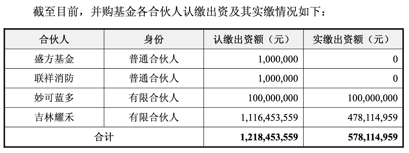 2020年6月,柴琇及其配偶控制的公司完成对“并购基金”普通合伙人吉林省联祥消防信息工程有限公司(以下简称“联祥消防”)100%股权的收购,联祥消防子公司吉林省耀禾经贸有限公司(以下简称“吉林耀禾”)是“并购基金”的最大出资方,认缴出资额为11.16亿元,实缴出资额4.78亿元。