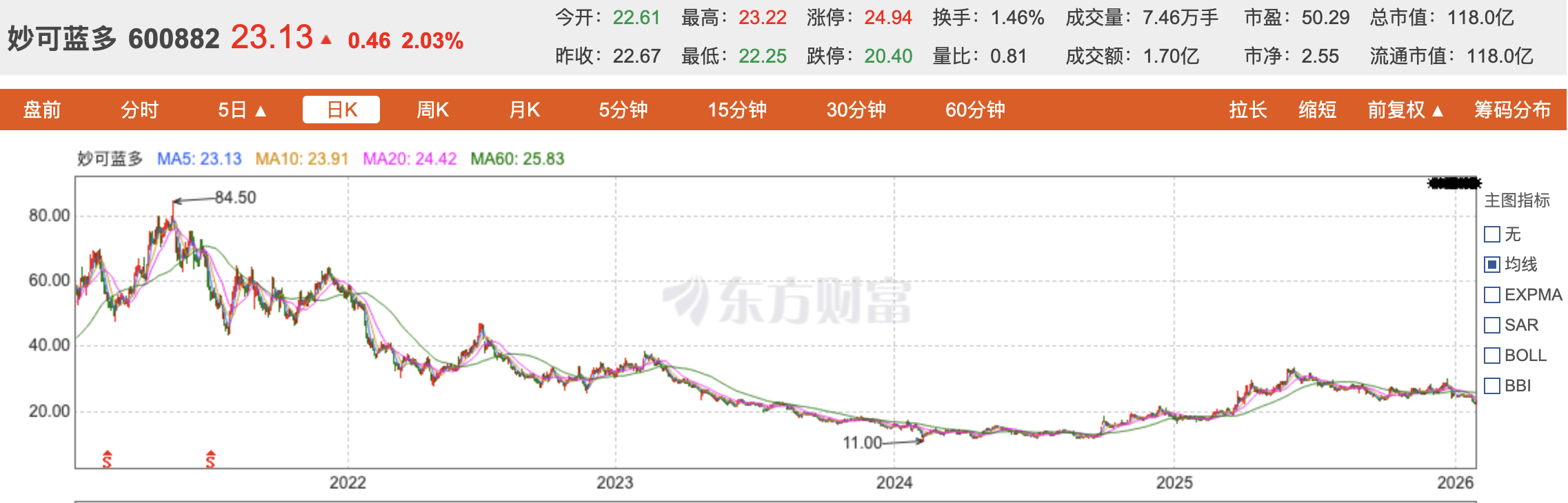 东方财富网数据显示,妙可蓝多股价自2021年冲上最高点之后便一路下行,截止1月29日,妙可蓝多股价报收于23.13元/股,总市值118亿元,不复往昔荣光。