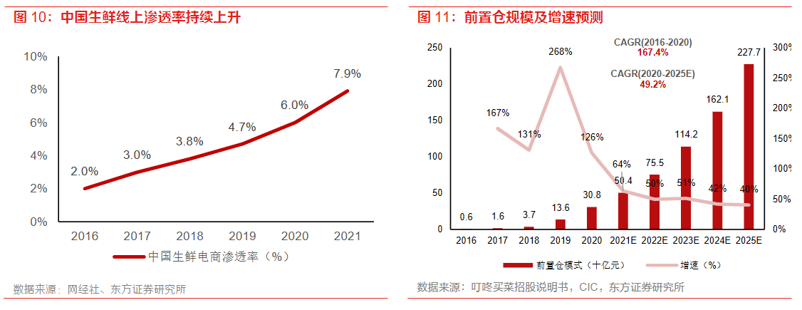 根据CIC预测2025年前置仓市场规模有望达到2277亿元,2020-2025E行业增长CAGR预计达49.2%。