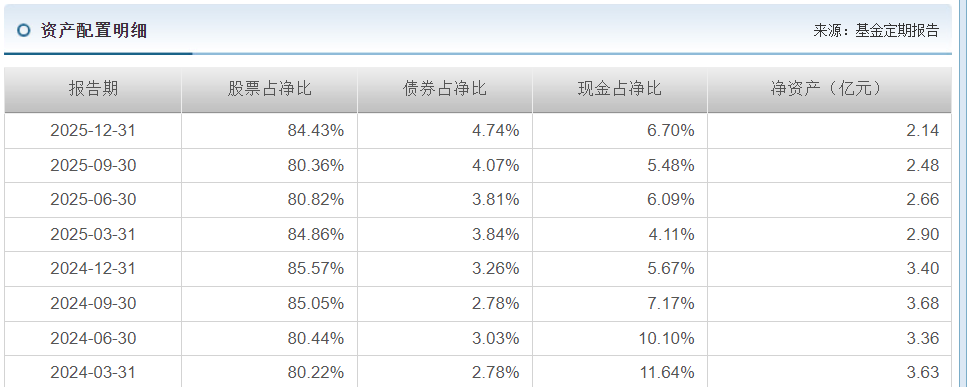 从资产配置看,自2024年9.24行情后,该产品向股票配置呈现波动性。2024年6月末该产品股票占净值 80.44%,9月末涨到85.05%,年底也维持在85.57%,结果2025年前三季度又持续下滑,直到2025年底才又把股票占比拉回84.43%,调仓节奏似乎未踩上市场步伐。