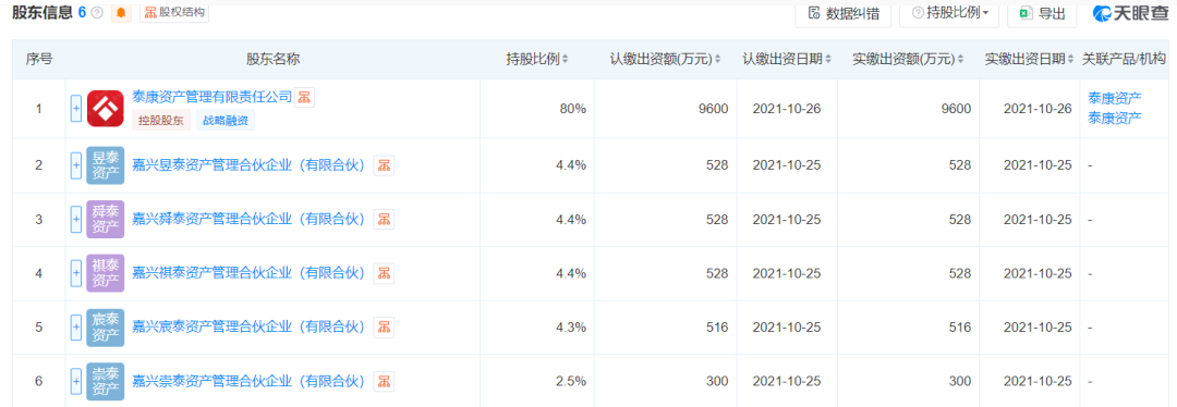 从泰康基金的股权结构来看,泰康资产出资9600万元,持有80%的股份,另外5名股东中,嘉兴舜泰资产、嘉兴祺泰资产、嘉兴昱泰资产、嘉兴宸泰资产、嘉兴崇泰资产等在内的5家员工持股平台出资2400万元,合计持有20%的股份。
