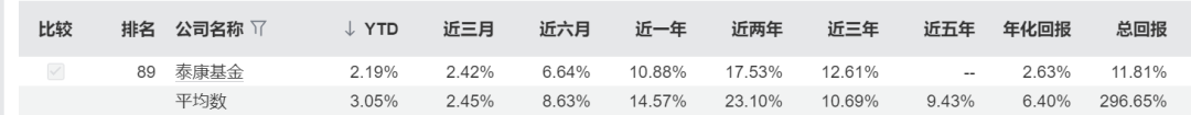 从业绩表现看,泰康基金旗下产品年化回报2.63%,低于行业平均的6.4%,近1年、近2年、近3年回报分别为10.88%、17.53%、12.61%,其中近3年回报高于行业平均的10.6%。其中股票型基金表现高于其他类型,近1年、近2年、近3年回报分别为28.55%、40.92%、25.65%。